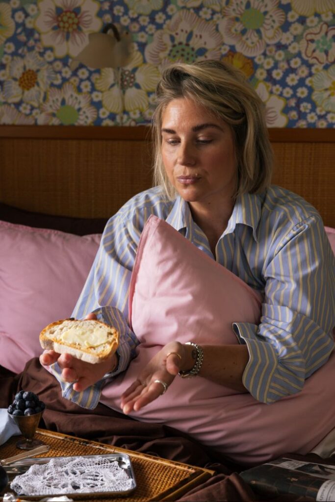 Weekdays, two iced coffees at home, maybe an egg if Magnus boils one for me. A knäckebröd sandwich that I grab in the car around 10! Weekends, maybe sourdough from our favourite bakery with cheddar and Caviar!