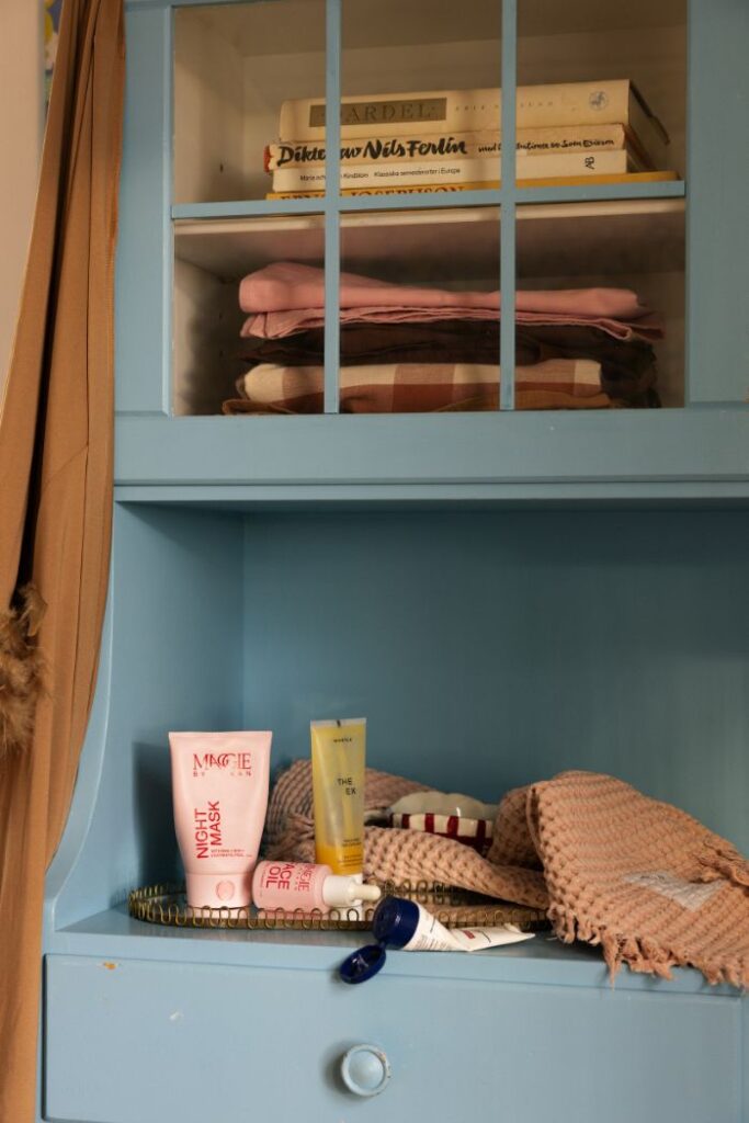 A huge glass of water, jewellery, a lamp that’s lit 24/7, and a night cream.
